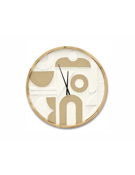 Reloj de pared esfera motivos abstractos 80d cm, un reloj decorativo de gran tamaño que combina funcionalidad con un estilo artístico. Sus motivos abstractos en relieve y la mezcla de materiales como madera y metal le otorgan un carácter moderno y único. Con un diámetro de 80 cm, se convierte en un elemento llamativo en salones o comedores. Funciona con una pila AA, ofreciendo precisión y estilo en una pieza duradera que además aporta diseño y personalidad a cualquier pared.