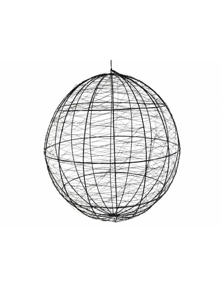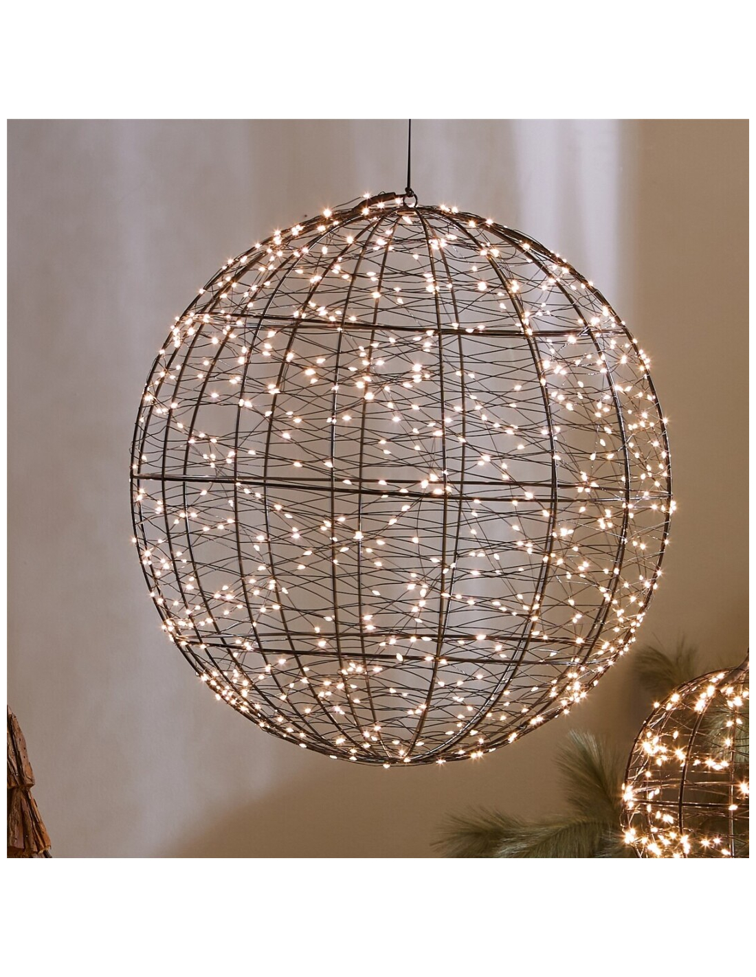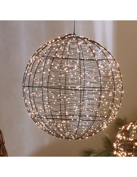 Bola negra leds 50d cm 800 leds, la más impactante de la colección gracias a sus dimensiones de 50 cm de diámetro y sus 800 luces LED cálidas que envuelven toda la estructura metálica negra. Es perfecta para espacios amplios donde quieras lograr un efecto decorativo imponente y contemporáneo. Funciona con adaptador de 12V y permite elegir entre luz fija o parpadeante, ideal para personalizar la ambientación. Su resistencia IP44 garantiza un uso seguro en interiores y exteriores cubiertos. El cable de 5 metros facilita la colocación en distintos rincones. Fabricada en metal duradero para asegurar estabilidad. Una pieza que transforma cualquier ambiente en un escenario festivo lleno de brillo y estilo.