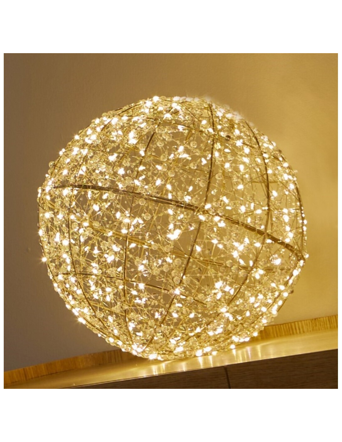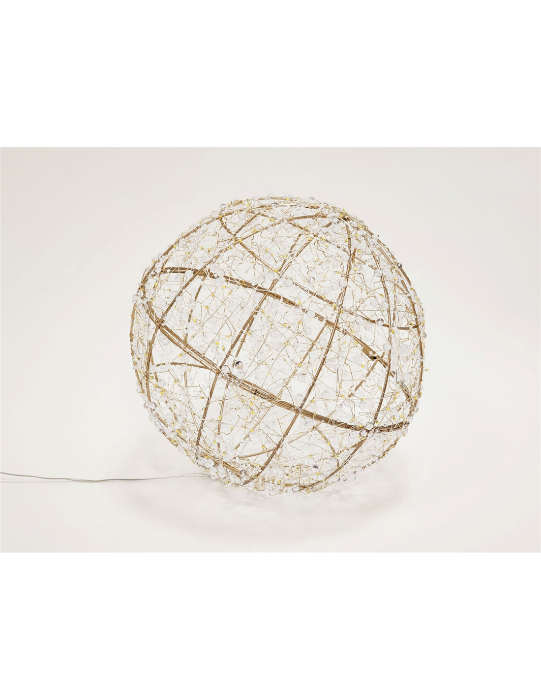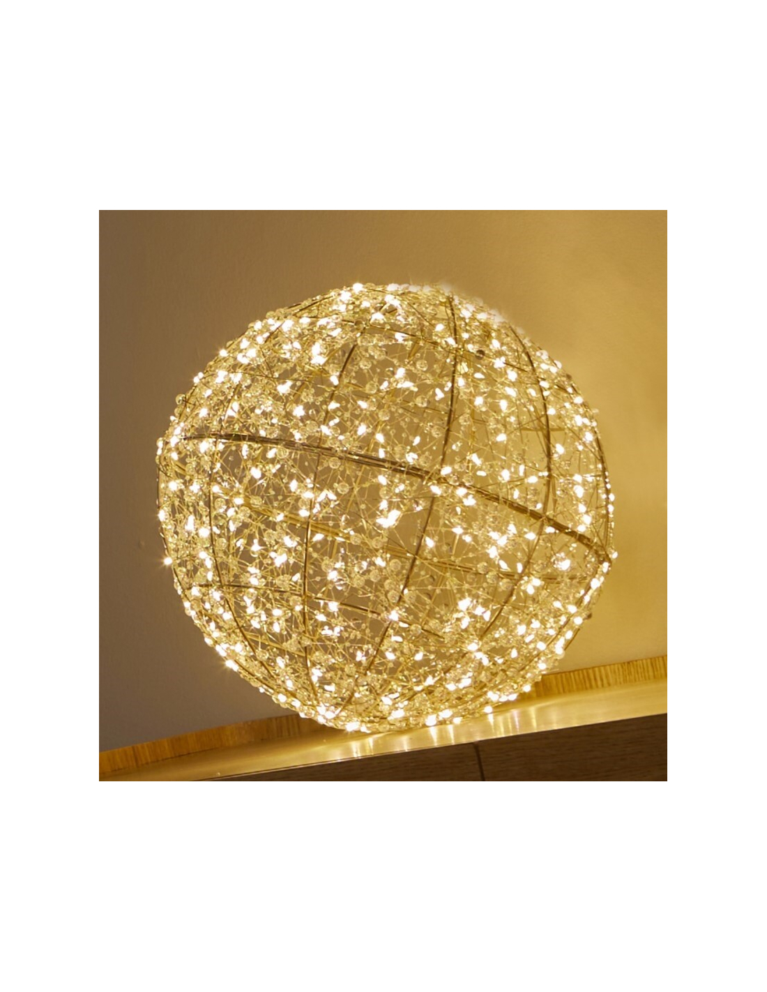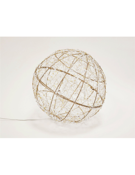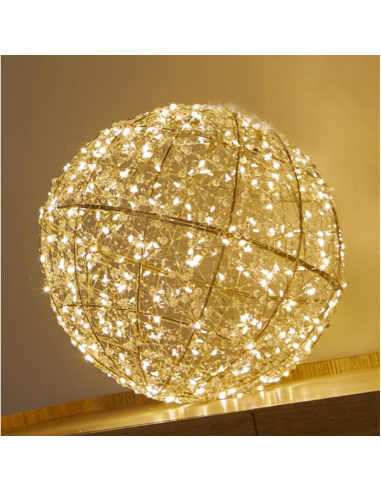 Bola oro perlas 30d cm 500 leds, esta esfera luminosa con acabado dorado y detalles de perlas crea un efecto brillante y sofisticado que realza cualquier ambiente. Con 500 luces LED de tono cálido distribuidas de manera uniforme, ofrece una iluminación acogedora y envolvente ideal para interiores y exteriores. Su estructura metálica con recubrimiento en pvc asegura durabilidad y resistencia, mientras que el transformador de 31V 9W garantiza un consumo eficiente. Es perfecta para decorar salones, escaparates o terrazas, aportando un aire elegante y moderno. El cable de 5 metros facilita la instalación en diferentes espacios. Su diseño versátil permite usarla colgante, sobre muebles o incluso en rincones estratégicos para resaltar la decoración. Una pieza que combina estilo, luz y calidez para transformar tus espacios.
