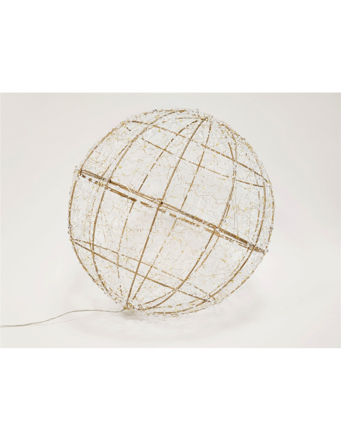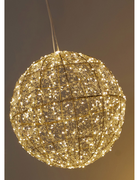 Bola oro perlas 40d cm 600 leds, una esfera dorada de gran tamaño que aporta un efecto luminoso impactante gracias a sus 600 luces LED de tono cálido. Su diseño con estructura metálica recubierta en pvc y acabados perlados brinda un aire sofisticado y decorativo, ideal para eventos, fiestas o como punto focal en la decoración del hogar. Funciona con adaptador de 12V e incluye opción de luz fija o parpadeante, lo que permite variar la ambientación según la ocasión. Con un diámetro de 40 cm, se convierte en un elemento protagonista que llena el espacio con su brillo elegante. Su cable de 5 metros facilita la conexión y el montaje. Resistente para interiores y exteriores gracias a su clasificación IP44, es una opción práctica y estética. Una pieza que no pasa desapercibida.
