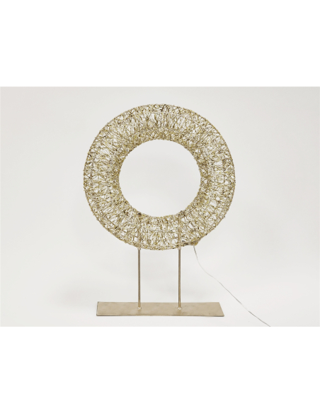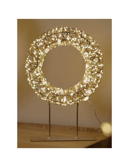 Corona oro pet c/pie 28d cm 800 leds, una corona luminosa con diseño circular y acabado dorado que aporta calidez y elegancia a cualquier espacio. Con 28 cm de diámetro y 800 luces LED cálidas, logra un efecto brillante y acogedor que resalta tanto en interiores como en áreas cubiertas. Su estructura de metal y PVC asegura ligereza y resistencia, mientras que el pie incluido permite exhibirla sobre mesas, aparadores o repisas sin necesidad de colgarla. Cuenta con 9 modos de funcionamiento para variar la intensidad y el tipo de luz según el momento, desde fija hasta intermitente. Su transformador de 31V 6W garantiza eficiencia energética y seguridad en el uso diario. El cable de 5 metros facilita la conexión en cualquier espacio. Una pieza compacta pero vistosa que combina funcionalidad y estilo en la decoración.