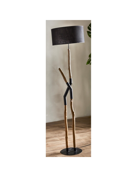 Lámpara de pie Dedalo madera y pantalla negra. Ideal para espacios rústicos y modernos, en esta pieza se combina la madera con el metal. Con una estructura que imita una rama natural, la lámpara Dedalo cuenta con detalles en negro para dar con un look más actual.