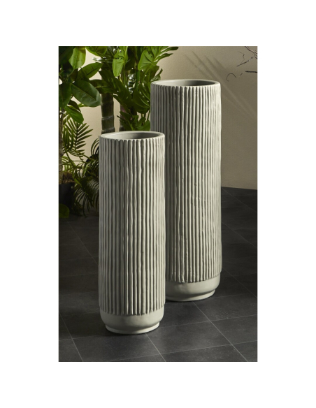 Set 2 vasijas Relieve líneas verticales topo. Con estos jarrones cilíndricos podrás decorar cualquier rincón de la casa. Su diseño es simple, pero cuenta con un relieve de líneas verticales que le aportan estilo y elegancia.