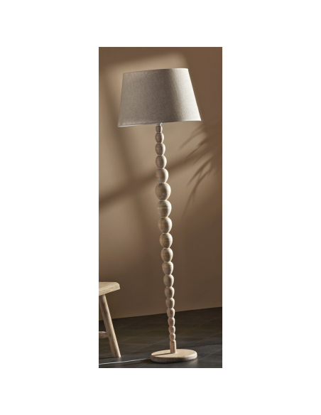 Lámpara de pie Riker madera. Una lámpara de pie sencilla, pero muy original. En la lámpara Riker encontramos una base en madera con forma de bolitas, con una pantalla de tela color beige. Ideal para espacios rústicos y minimalistas.