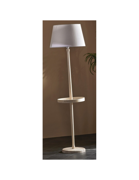 Lámpara de pie Soval con mesita. Una pieza que combina una lámpara y una mesita auxiliar. La lámpara Soval es ideal para un recibidor o a un lado del sofá, aportando funcionalidad y estilo con su estructura en madera clara y pantalla de tela.