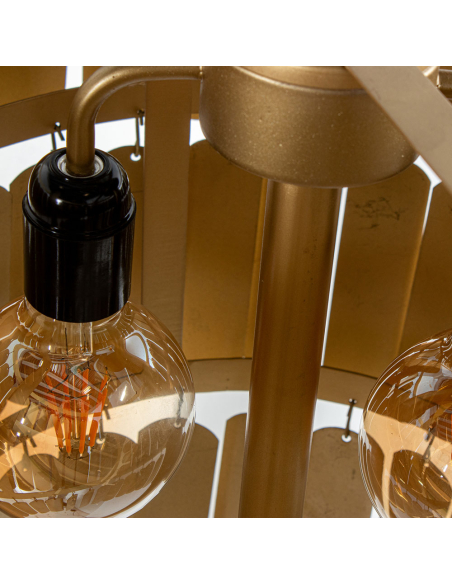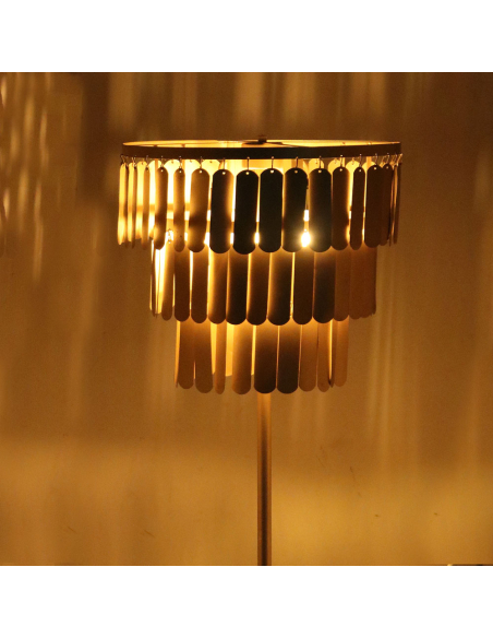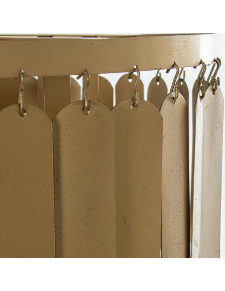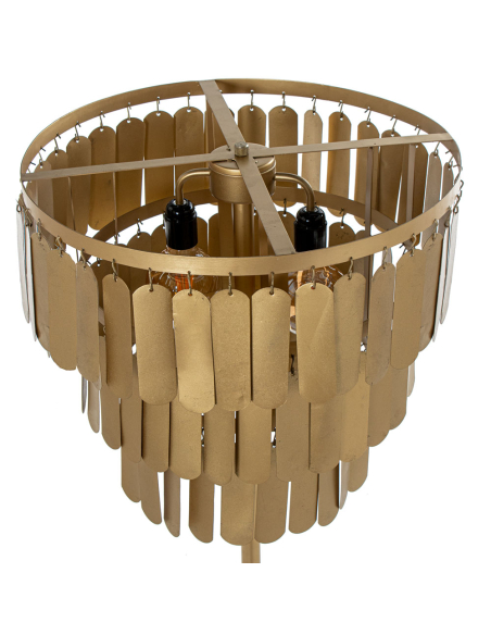 Lámpara de pie Matilde láminas dorada, combina funcionalidad y estilo con su diseño de láminas de hierro colgantes. Estas piezas metálicas, dispuestas con precisión, permiten que la luz se filtre delicadamente, generando un ambiente acogedor y sofisticado. Con una estructura alta y sólida, esta lámpara es ideal para complementar espacios contemporáneos, industriales o minimalistas, aportando un toque moderno y elegante.