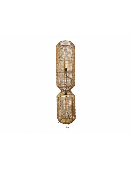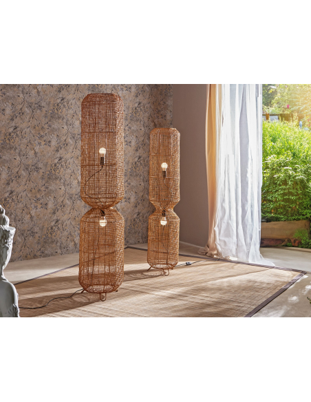 Lámpara de pie Aurora 130 cm, con su estructura elaborada en ratán, presenta una forma que recuerda a un reloj de arena, con dos secciones cilíndricas unidas en el centro. El ratán, tejido de forma intrincada, crea un entramado abierto que deja entrever la luz de las dos bombillas ubicadas en su interior, generando un juego de luces y sombras que añade un toque de magia y misterio al ambiente. Esta lámpara de pie es perfecta para añadir un toque de luz ambiental y un elemento de diseño distintivo a cualquier espacio, ya sea en el salón, el dormitorio o el estudio.