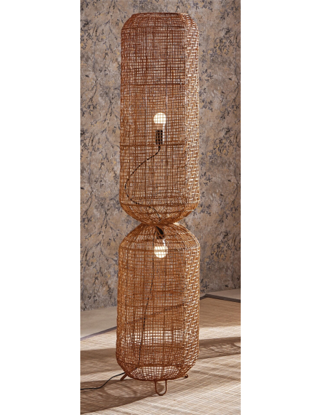 Lámpara de pie Aurora 150 cm, con su estructura elaborada en ratán, presenta una forma que recuerda a un reloj de arena, con dos secciones cilíndricas unidas en el centro. El ratán, tejido de forma intrincada, crea un entramado abierto que deja entrever la luz de las dos bombillas ubicadas en su interior, generando un juego de luces y sombras que añade un toque de magia y misterio al ambiente. Esta lámpara de pie es perfecta para añadir un toque de luz ambiental y un elemento de diseño distintivo a cualquier espacio, ya sea en el salón, el dormitorio o el estudio. Su altura y su forma esbelta la convierten en un punto focal atractivo, ideal para iluminar rincones oscuros o para crear un ambiente acogedor y relajante.