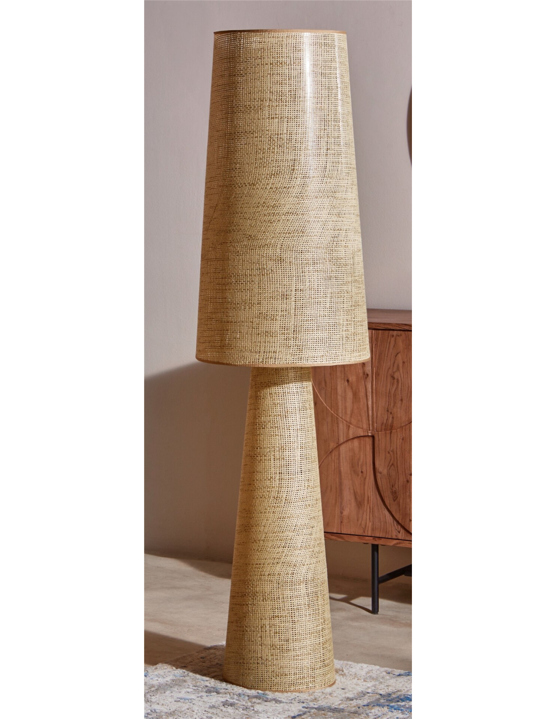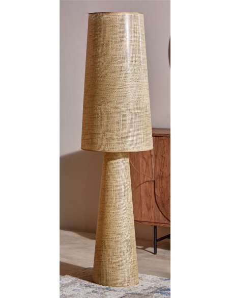 Lámpara de pie Nash 150 cm, con pantalla envolvente en papel efecto ratán que aporta naturalidad y frescura al ambiente. Su base en metal garantiza estabilidad, mientras que el acabado trenzado proyecta un juego de luces cálido y acogedor. Ideal para quienes buscan un estilo mediterráneo o rústico actualizado. Su altura genera un impacto visual en el espacio, funcionando como pieza protagonista. Perfecta para salones amplios o dormitorios donde se busque una iluminación ambiental envolvente. Su acabado artesanal transmite calidez y autenticidad en cada detalle.