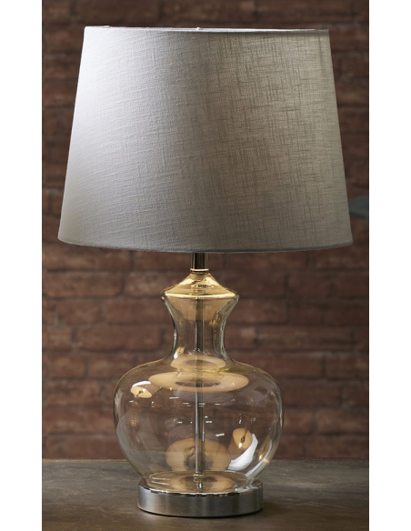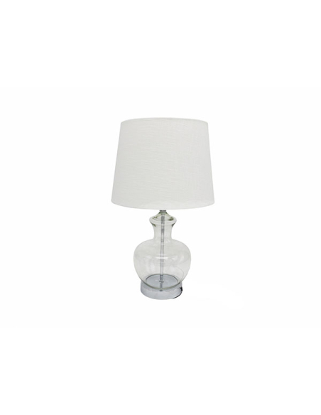 Lámpara de sobremesa Haimi con el pie de cristal con acabado plata y pantalla de color claro.