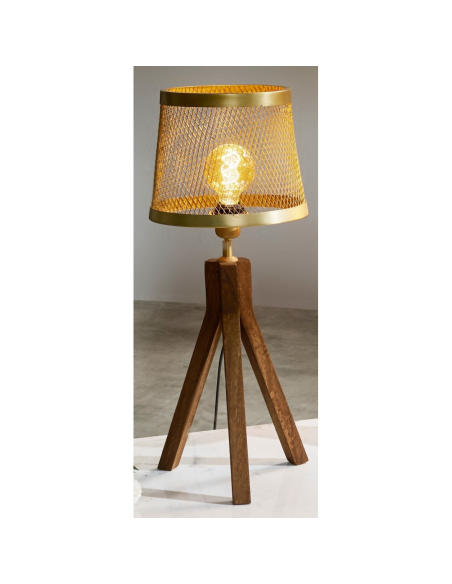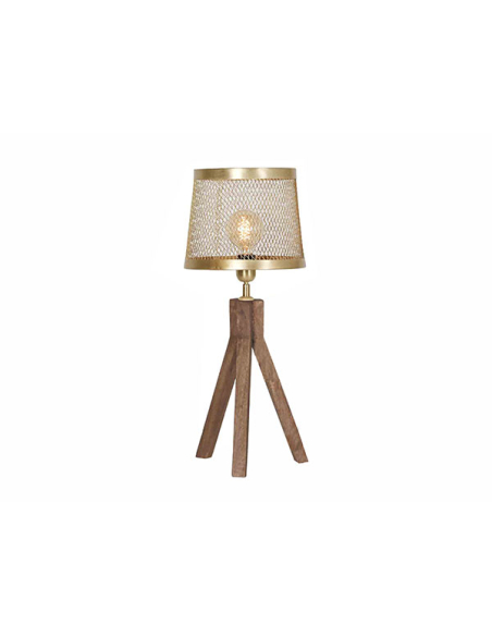Lámpara de mesa Addis madera y oro 63 cm. Con una altura de 63 cm, esta lámpara de sobremesa es ideal para colocar sobre muebles de gran tamaño. Su trípode en madera contrasta con la pantalla metálica de rejilla dorada, aportando un brillo especial.