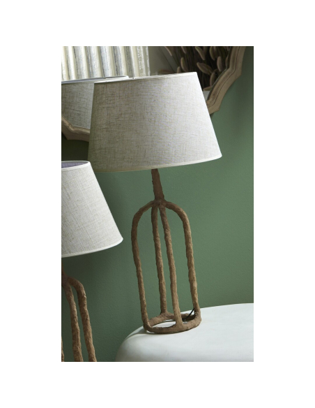 Lámpara de mesa Asim marrón 72 cm. Con una altura de 72 cms, la lámpara de sobremesa Asim aporta diseño en cualquier rincón. Su base de papel maché marrón le da un estilo rústico, mientras que su pantalla de tejido beige aporta elegancia.