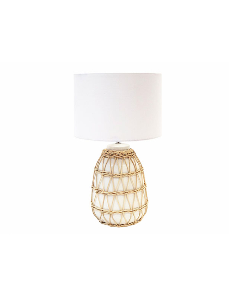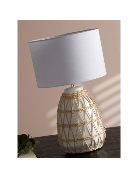 Lámpara de mesa Athit blanca. Una lámpara perfecta para espacios minimalistas. La lámpara de sobremesa Athit cuenta con una estructura completamente blanca, sobre la cual destaca el entramado de fibras vegetales que suma estilo.