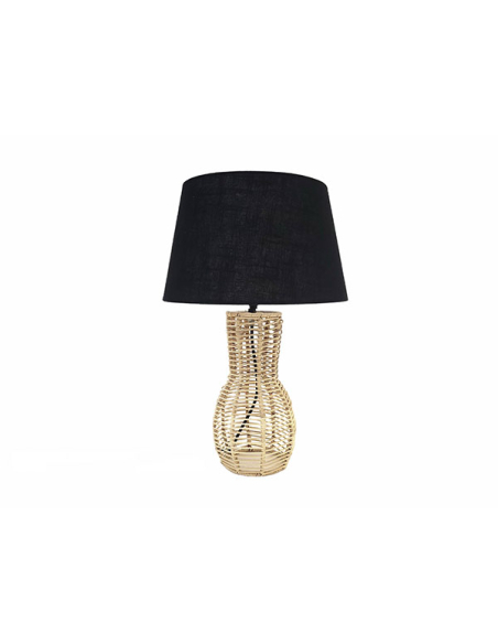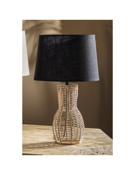 Lámpara de mesa fibras naturales y negro. Con una base trenzada en fibras naturales, esta lámpara de sobremesa es ideal para espacios nórdicos y modernos. La base en color beige contrasta con el cable y la pantalla de lino en color negro.