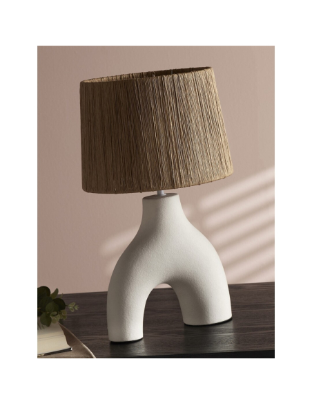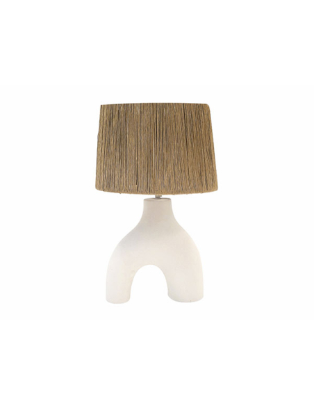Lámpara de mesa Kopex 48 cm. En cerámica blanca y una pantalla de fibras naturales, la lámpara de sobremesa Kopek es ideal para dormitorios o salones escandinavos. Destaca su base en forma de arcos, que aporta originalidad.