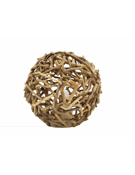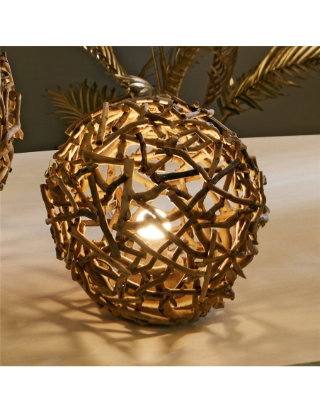 Lámpara bola ramas natural, está elaborada con ramas de árbol del té entrelazadas de forma artesanal, creando una estructura orgánica y texturizada que deja entrever la luz de forma sutil y difusa. El color natural de la madera aporta calidez y autenticidad, mientras que su diseño único la convierte en una pieza decorativa por sí misma. Perfecta para colocar sobre una mesa auxiliar, una mesita de noche o incluso en el suelo, esta lámpara es una invitación a crear un ambiente relajante e íntimo, donde la luz y la naturaleza se fusionan en perfecta armonía. Su diseño versátil se adapta a una variedad de estilos decorativos, desde los más rústicos hasta los más modernos.