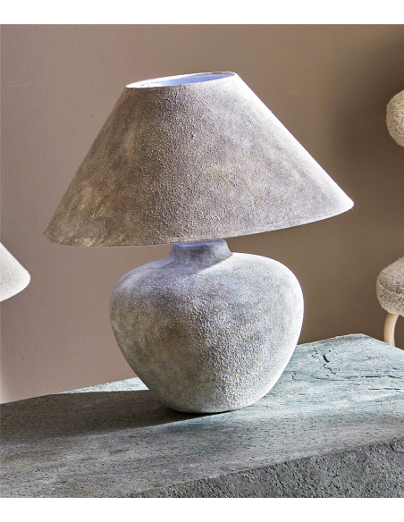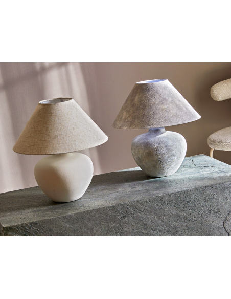 Lámpara sobremesa Hestia piedra 48 cm, su base elaborada en cerámica, presenta una forma redondeada y orgánica, con un acabado que imita la textura y el color de la piedra natural. La pantalla, también con un acabado, complementa a la perfección la estética de la base, creando un conjunto armonioso y relajante. La luz, al filtrarse a través de la pantalla, crea un ambiente cálido e íntimo, perfecto para disfrutar de momentos de lectura o relajación. Esta lámpara es una pieza versátil que se adapta a una variedad de estilos decorativos
