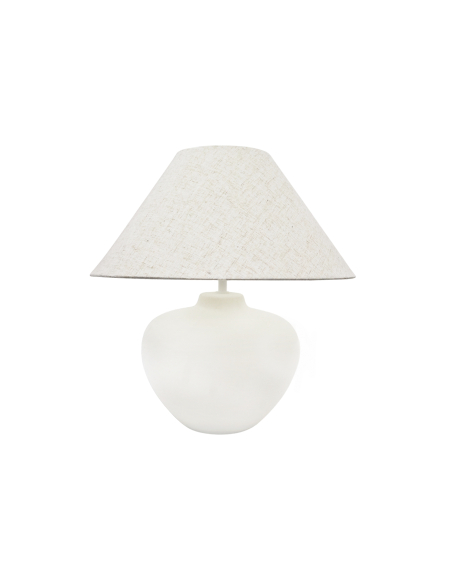 Lámpara sobremesa Hestia piedra beige 48 cm, su base elaborada en cerámica, presenta una forma redondeada y orgánica, con un acabado que imita la textura y el color de la piedra beige. La pantalla, también con un acabado, complementa a la perfección la estética de la base, creando un conjunto armonioso y relajante. La luz, al filtrarse a través de la pantalla, crea un ambiente cálido e íntimo, perfecto para disfrutar de momentos de lectura o relajación. Esta lámpara es una pieza versátil que se adapta a una variedad de estilos decorativos