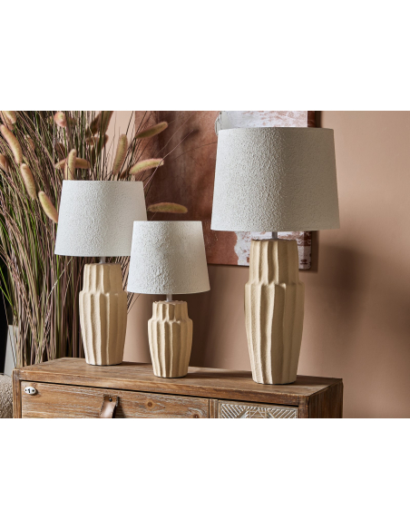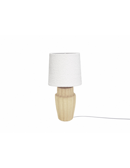 Lámpara de sobremesa Mesana 37 cm, se distingue por su base de cerámica con relieves y pantalla en tela pintada que difunde la luz de manera delicada. Perfecta para espacios reducidos que buscan un detalle de estilo, resulta muy funcional en mesas auxiliares o escritorios. Su diseño sencillo con textura artesanal convierte cualquier rincón en un lugar más cálido y personal. Aporta equilibrio entre funcionalidad y estética en la decoración. Es una opción ideal para quienes disfrutan de ambientes acogedores y bien iluminados.