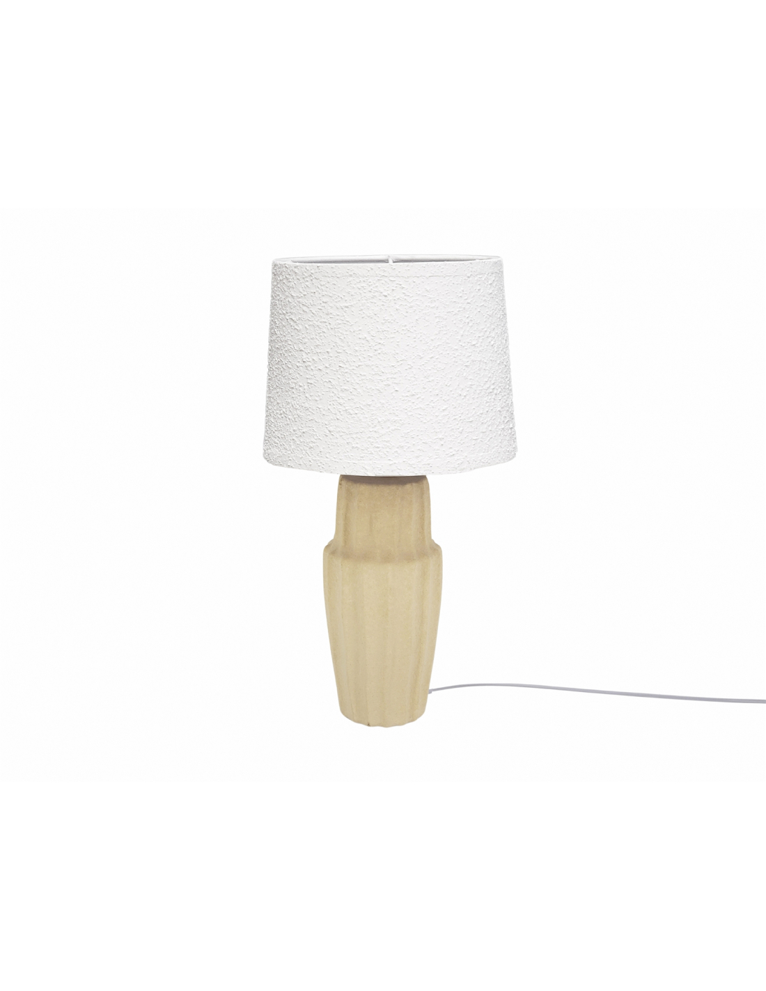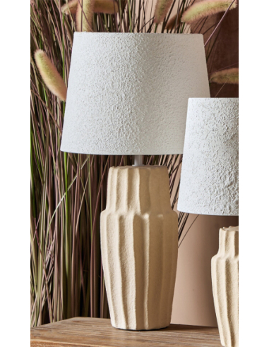 Lámpara de sobremesa Mesana 47 cm, con una base de cerámica de líneas marcadas y pantalla textil pintada, brinda un equilibrio entre rusticidad y elegancia. Su altura intermedia la hace adecuada para decorar aparadores, consolas o mesas de noche, aportando una iluminación acogedora. Los tonos neutros la convierten en una pieza versátil para múltiples estilos decorativos. Es una lámpara que ofrece un toque sofisticado sin perder naturalidad. Ideal para complementar tanto espacios clásicos como modernos.