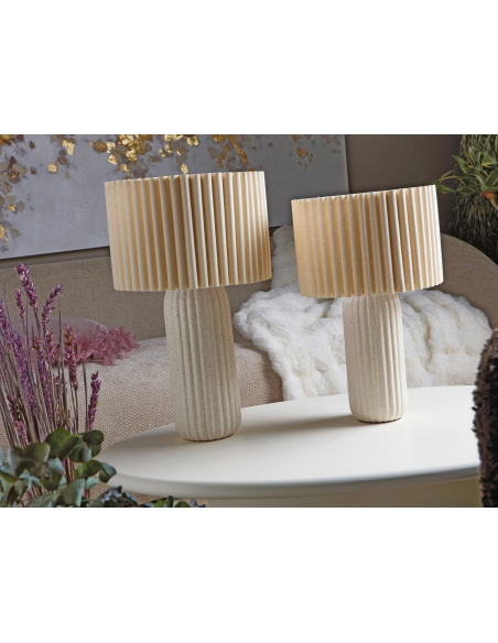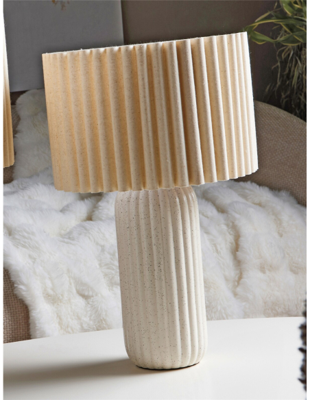 Lámpara de sobremesa Artemisa 43 cm, presenta una base de cerámica con acabado trabajado y pantalla compuesta de poliéster, lino y PVC, lo que le da un aire sofisticado y atemporal. Perfecta para complementar espacios con un estilo clásico o boho chic, ofrece una luz cálida y envolvente. Una opción decorativa funcional y elegante para cualquier rincón del hogar. Su mezcla de materiales aporta textura y profundidad visual. Es la elección adecuada para quienes valoran piezas con personalidad y calidad artesanal.