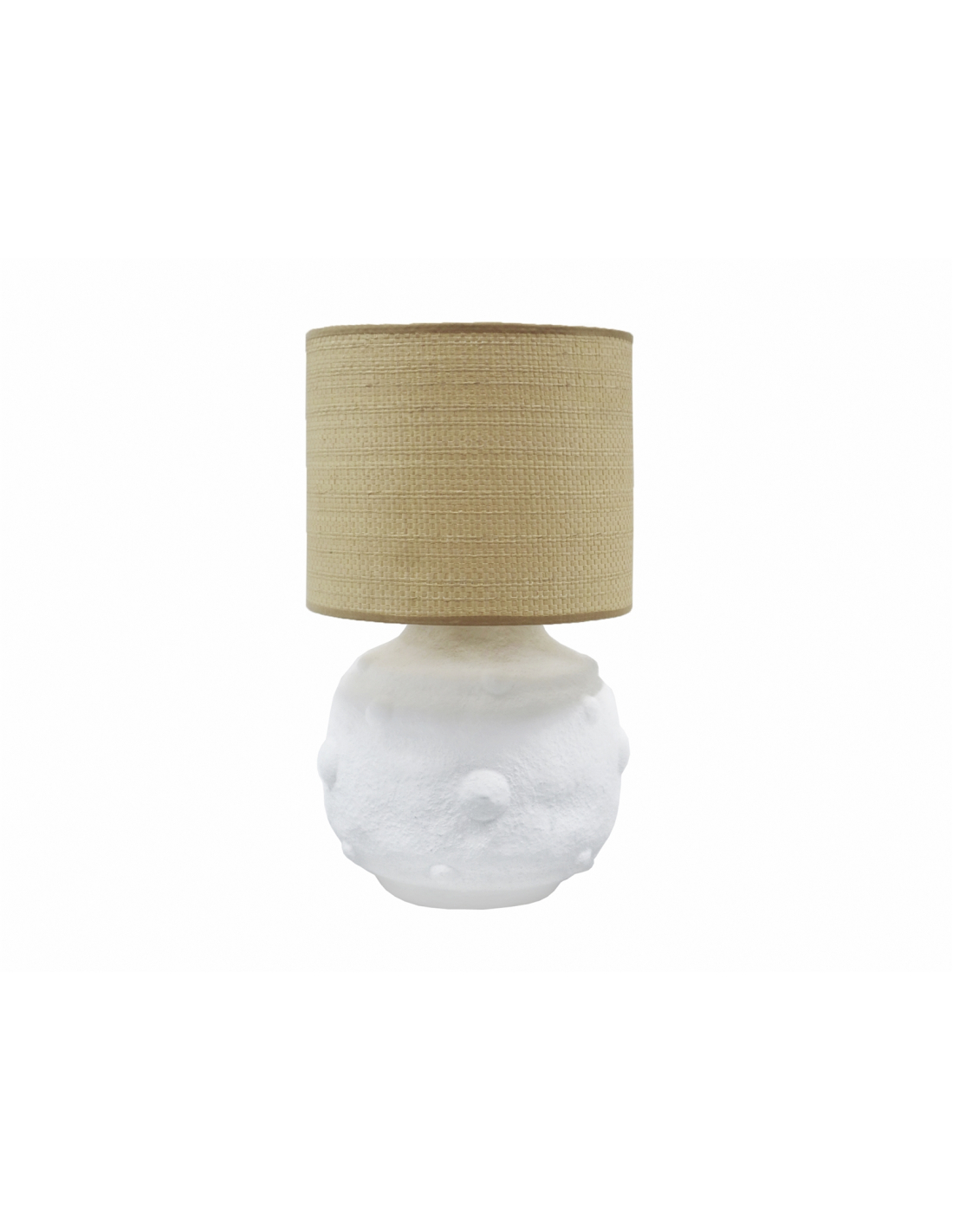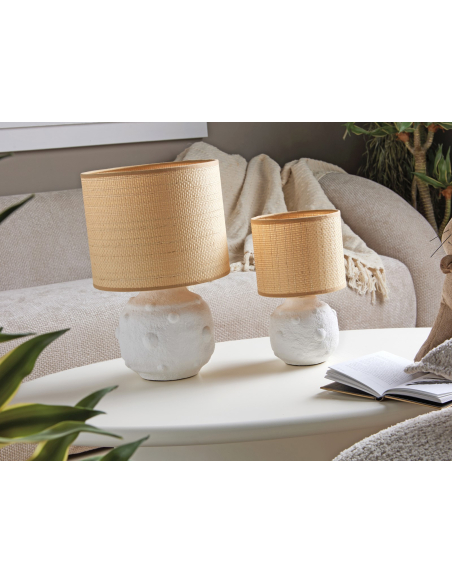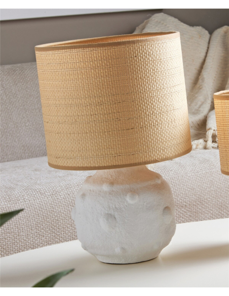 Lámpara de sobremesa Selene 36 cm, combina la frescura del papel efecto ratán con una base de cerámica blanca de acabado suave. Su tamaño compacto la hace ideal para mesillas de noche, escritorios o rincones que necesiten luz puntual con mucho estilo. Aporta un aire acogedor, con un diseño atemporal que encaja fácilmente en distintos estilos decorativos. Su diseño delicado y sus proporciones equilibradas permiten usarla en pares para generar simetría en dormitorios o salones. Ofrece un equilibrio perfecto entre funcionalidad y estética, aportando tanto iluminación como carácter. Es una apuesta segura para quienes valoran lo natural y lo artesanal.