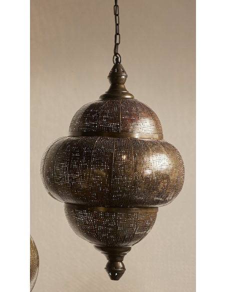 Lámpara de techo Bluma cobre 40 cm. De cobre envejecido y oro, la lámpara colgante Bluma es perfecta para interiores con inspiración oriental o bohemios. Por su diseño, proyecta una iluminación muy original que transforma cualquier espacio.