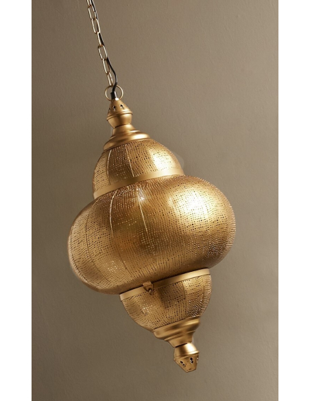 Lámpara de techo Bluma oro 36 cm. La pequeña lámpara colgante Blume de estilo oriental es el complemento perfecto para decorar tus espacios. De metal dorado, de sus microperforaciones se escapa la luz, creando un efecto muy especial.