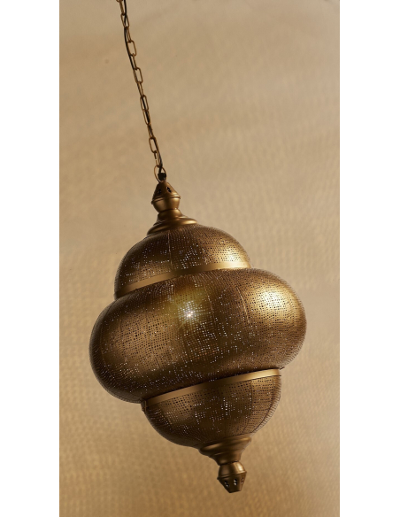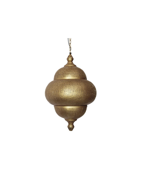 Lámpara de techo Bluma oro 40 cm. En metal dorado y con pequeñas perforaciones, la lámpara colgante Blume es perfecta para espacios de estilo oriental o bohemio. Brinda una luz tenue y cálida en cualquier espacio con esta pieza.