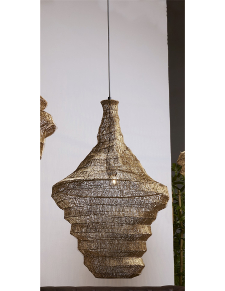 Lámpara de techo Thea oro 80 cm. Con una forma muy original y de rejilla color oro, la lámpara colgante Thea será la protagonista de cualquier espacio. Un diseño que encaja a la perfección en espacios bohemios y rústicos.