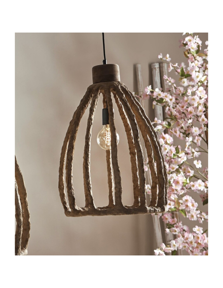 Lámpara de techo Akil marrón 58 cm. Con una estructura en forma de jaula, la lámpara Akil es ideal para cocinas, recibidores o dormitorios rústicos. En papel maché marrón, es una pieza muy original.