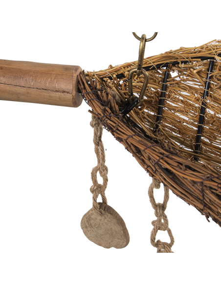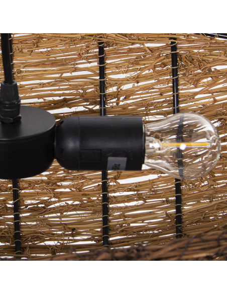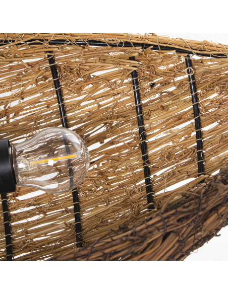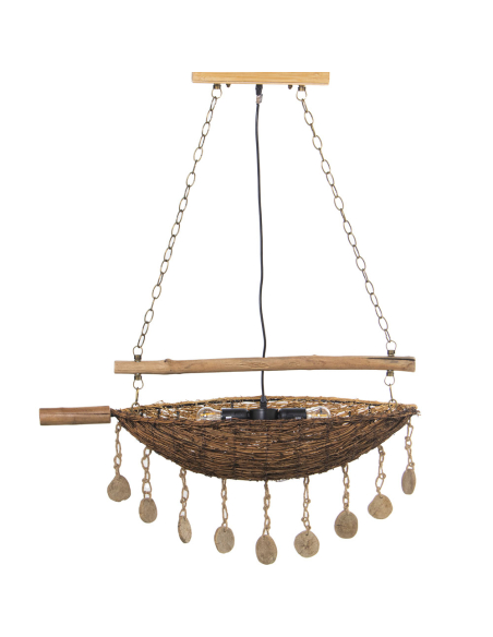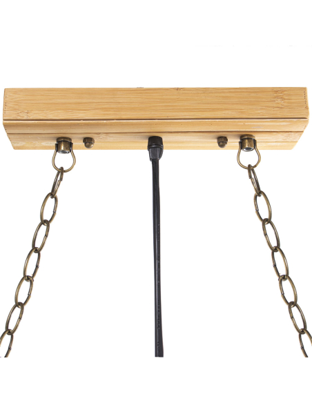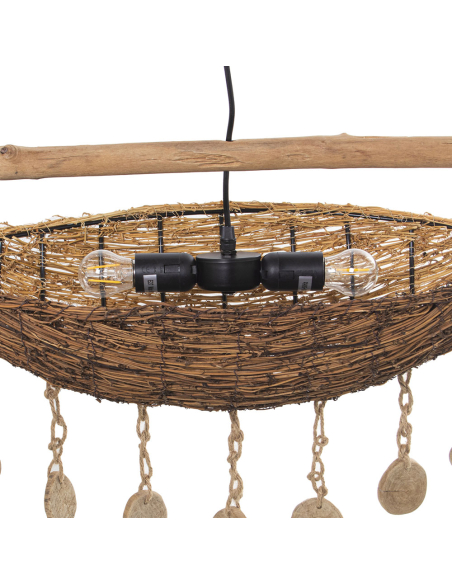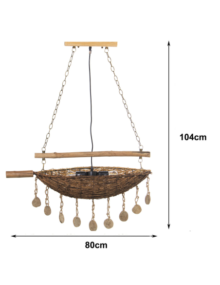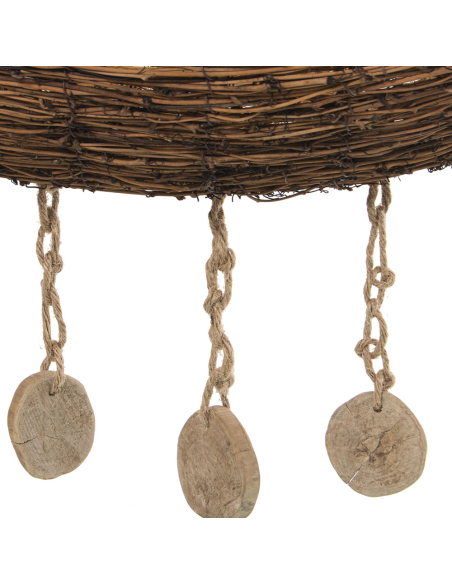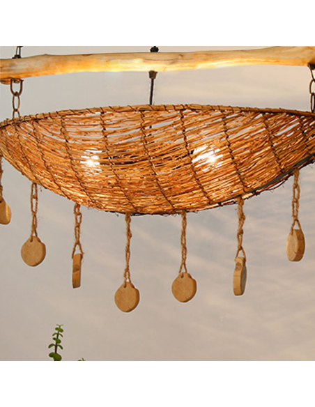 Lámpara de techo de bambú canasta, es una verdadera obra de arte decorativa, combinando bambú entrelazado, madera natural y detalles únicos que realzan su diseño artesanal. La estructura principal está elaborada con ramas de bambú trenzado, mientras que una barra de madera suspendida con cadenas de metal sostiene el conjunto, aportando robustez y equilibrio visual. Colgantes de cuerda natural con discos de madera decorativos añaden un toque rústico y bohemio, creando movimiento y dinamismo en la pieza. La luz que emite se filtra a través del trenzado del bambú, generando un efecto cálido y envolvente que transforma cualquier espacio en un ambiente acogedor. Esta lámpara es ideal para comedores, salones o espacios con temática natural y boho, convirtiéndose en un punto focal llamativo gracias a su combinación de materiales orgánicos y elementos colgantes decorativos.