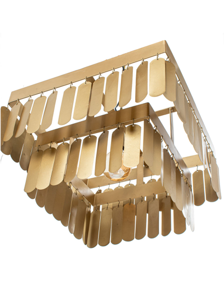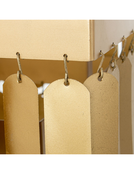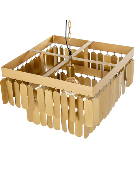 Lámpara de techo Matilde de hierro colgante dorada, es una pieza sofisticada que combina un diseño moderno con detalles clásicos. Con una estructura de hierro en tono dorado mate, su cuerpo cuadrado destaca por las múltiples láminas suspendidas que caen delicadamente creando una apariencia visual dinámica y llamativa. La cadena colgante dorada complementa el diseño y aporta cohesión estética a la lámpara. Perfecta para espacios donde se busca un toque de lujo y modernidad, como comedores, salas de estar o ambientes elegantes.