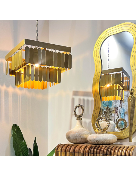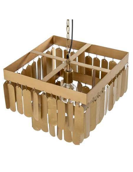 Lámpara de techo Matilde de hierro colgante larga dorada, una lámpara colgante que combina lo mejor de dos mundos: la solidez del hierro y la calidez natural de la madera. Su diseño redondo presenta una estructura de hierro dorado que sostiene una serie de láminas de madera natural cuidadosamente trabajadas. Las láminas caen en un patrón uniforme, creando un efecto visual envolvente y elegante. Esta pieza destaca por su mezcla de materiales, ideal para espacios rústicos, contemporáneos o decoraciones donde se busque equilibrio entre modernidad y naturaleza. La cadena metálica dorada completa el diseño, añadiendo estabilidad y un toque decorativo adicional.