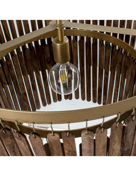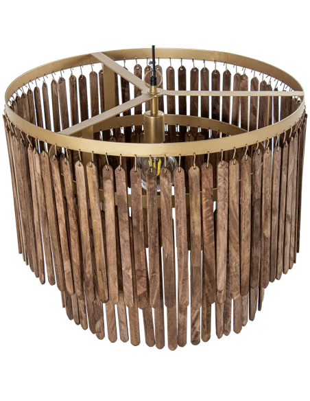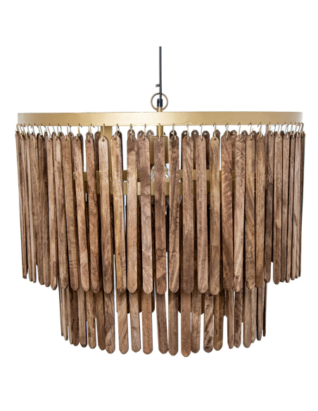 Lámpara de techo Catalina colgante, diseño rústico e industrial que combina a la perfección el hierro robusto con detalles naturales de madera. La estructura de hierro negro sostiene una elegante disposición de piezas de madera colgantes, talladas con precisión para crear una apariencia única y natural. Ideal para quienes buscan un toque cálido y moderno en su hogar, esta lámpara se adapta a comedores, salas de estar y espacios de estilo contemporáneo o campestre.