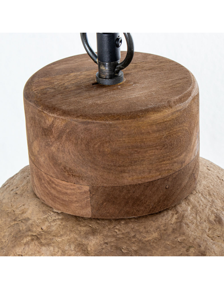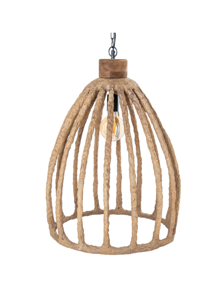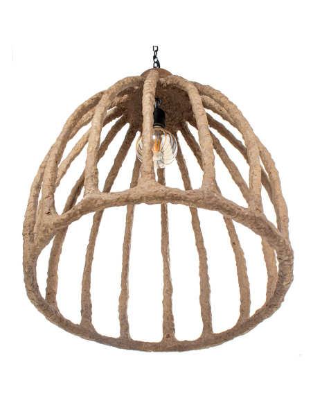 Lámpara de techo colgantes de papel rústico, hecha a mano con papel maché, diseñada para aportar carácter y personalidad a cualquier ambiente. La estructura abierta y curva, inspirada en jaulas naturales, permite que la luz se filtre de manera suave y cálida, creando un efecto acogedor y relajante. Ideal para espacios bohemios, minimalistas o modernos que buscan un toque orgánico y artesanal.