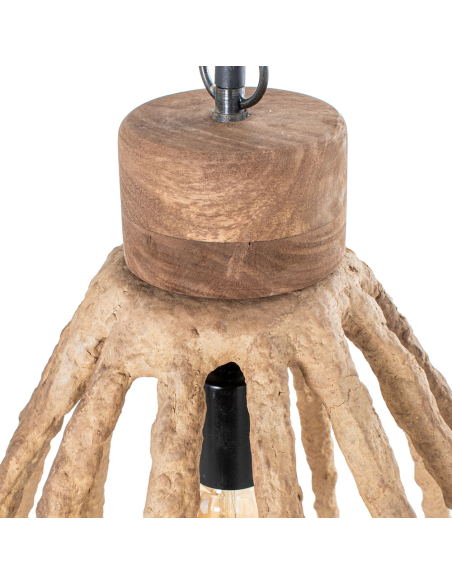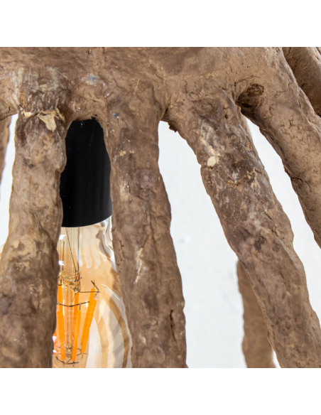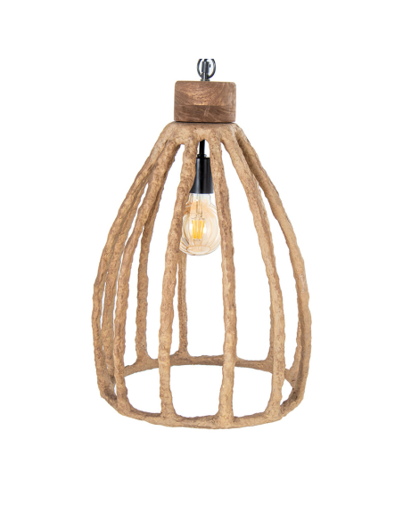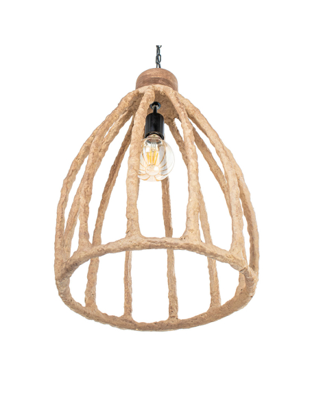 Lámpara de techo colgantes de papel rústico alargada, hecha a mano con papel maché, diseñada para aportar carácter y personalidad a cualquier ambiente. La estructura abierta y curva, inspirada en jaulas naturales, permite que la luz se filtre de manera suave y cálida, creando un efecto acogedor y relajante. Ideal para espacios bohemios, minimalistas o modernos que buscan un toque orgánico y artesanal.