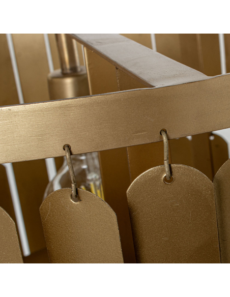 Lámpara de techo Matilde láminas dorada 43 cm, diseñada para aportar carácter y estilo a cualquier espacio. Esta pieza de iluminación está elaborada completamente en hierro y presenta un diseño industrial con láminas metálicas suspendidas que le otorgan textura y movimiento. Su estructura cuadrada combina con una cadena de hierro que permite colgarla firmemente desde el techo, brindando estabilidad y un aspecto robusto. Las láminas metálicas tienen un acabado envejecido con tonos dorados, lo que añade un toque único de personalidad y elegancia rústica. Esta lámpara es ideal para ambientes modernos, lofts industriales o decoraciones eclécticas donde se quiera destacar una pieza llamativa.
