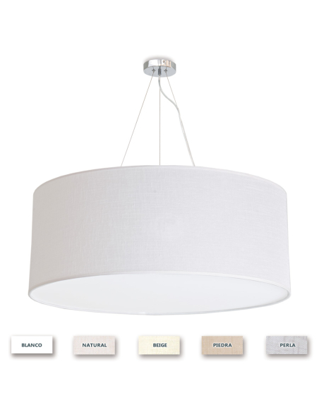 Lámpara de techo Dimensiones 80 cm diámetro. Un modelo que destaca por su amplio formato y potencia lumínica. Con capacidad para 5 bombillas E27. Un modelo perfecto para iluminar grandes espacios. Escoge el acabado de tu lámpara entre los diferentes colores disponibles. Si deseas adquirir esta lámpara con otro tipo de pantalla, contacta con nosotros y te asesoraremos.