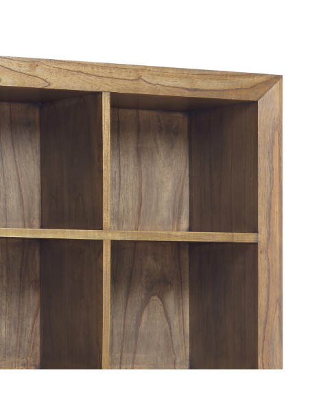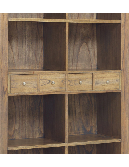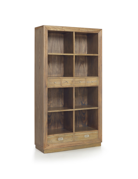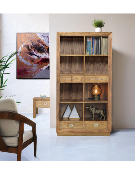¿Buscas una zona de almacenaje para todos tus libros? Con esta librería Merapi de seis cajones y ocho huecos esto ya no será un problema y será perfecta para la zona de lectura de tu salón o despacho. Almacénalos en sus huecos, agrupados en dos alturas de cuatro en cuatro. En sus pequeños cajones de la zona media puedes organizar bolígrafos o papeles, al igual que en los dos cajones de la zona inferior. Toda la pieza está apoyada sobre un zócalo y rodeada por un enmarcado de madera ingletado, otorgando a la pieza idea de solidez y calidad. Como el resto de la colección, está fabricada en madera de mindi que es una madera densa y dura similar al roble con un resultado de gran belleza y naturalidad.