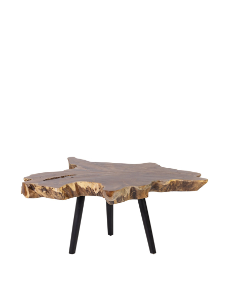Mesa de centro tronco árbol, única y de diseño rústico destaca por su tapa, formada por una rodaja de tronco de árbol con laterales irregulares que resaltan la belleza natural de la madera. Las tres patas en color negro ofrecen estabilidad y contrastan perfectamente con la calidez de la tapa, creando una pieza atractiva y funcional. Ideal para espacios que busquen un toque orgánico y contemporáneo, esta mesa es perfecta para salones, pasillos o como mesa auxiliar en cualquier habitación, añadiendo un carácter distintivo y natural a tu hogar.