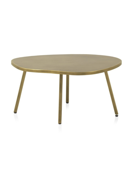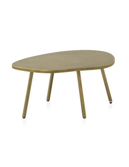 Mesa de centro Vendaval auxiliar dorado, su característica más distintiva es el tablero metálico con una forma irregular y fluida, como un guijarro pulido o una silueta abstracta, acabado en un elegante tono dorado envejecido. Tres patas metálicas finas y ligeramente inclinadas completan su diseño ligero. Esta mesa es ideal como superficie de apoyo junto a un sofá o butaca, aportando un toque artístico y funcional. Su forma orgánica rompe con la rigidez de las líneas rectas, mientras que el acabado dorado añade un punto de luz y glamour sutil. Su montaje de patas es muy sencillo. Perfecta para salones de estilo moderno, contemporáneo, nórdico chic o ecléctico. La mesa Vendaval es una pieza singular que combina diseño inspirado en la naturaleza con un acabado metálico refinado.
