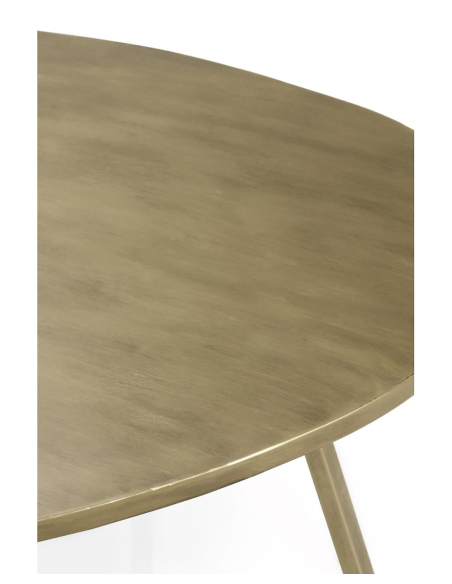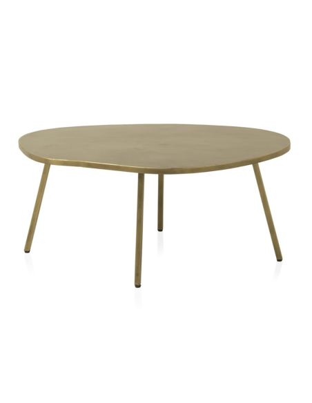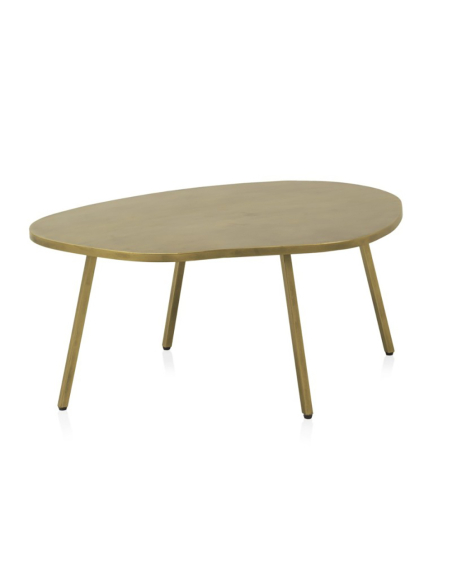 Mesa de centro auxiliar Vendaval dorado, presenta un tablero metálico de forma orgánica e irregular, evocando elementos naturales, con un refinado acabado dorado envejecido. Se sostiene sobre tres esbeltas patas metálicas inclinadas. Funcional y escultural, esta mesa auxiliar es ideal para colocar junto a un asiento, ofreciendo una superficie única para tus objetos cotidianos. Su diseño orgánico aporta suavidad visual, mientras que el acabado dorado introduce un toque de elegancia contemporánea. Requiere un montaje de patas muy sencillo. Una elección excelente para quienes buscan piezas singulares que aporten un toque artístico a su salón o zona de estar. Se integra armoniosamente en decoraciones modernas, eclécticas o contemporáneas.