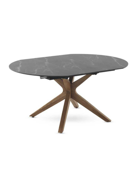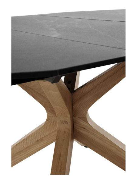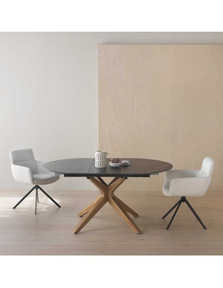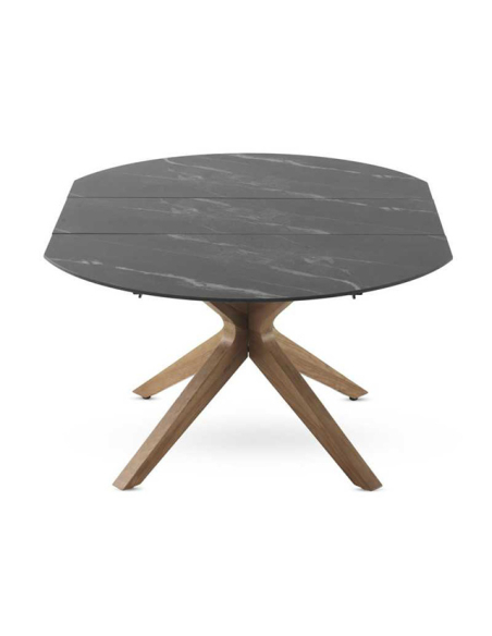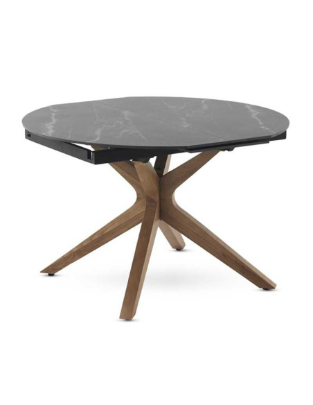 Mesa de comedor Selenita extensible mármol negro, combina elegancia y funcionalidad, ideal para comedores modernos. Su estructura de madera de roble garantiza estabilidad y resistencia, mientras que el sobre de cerámica tipo mármol negro Verona aporta sofisticación, fácil de limpiar y resistente a rayaduras. De forma redonda, esta mesa extensible permite ampliar su diámetro de 120 a 160 cm tirando de los extremos, perfecta para reuniones familiares o cenas con amigos. El pie central de roble proporciona soporte sólido, acomodando cómodamente entre 6 y 8 personas y convirtiéndose en el centro de atención de cualquier espacio.