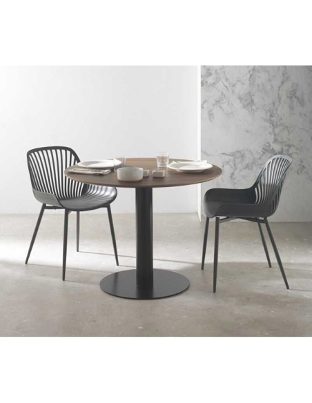 Mesa de comedor Hematita nogal, es una pieza ideal para comedores modernos que buscan combinar funcionalidad y estilo. Su tablero redondo de melamina color nogal aporta calidez y sofisticación al ambiente, mientras que el pie central metálico negro asegura estabilidad y durabilidad. Diseñada para acomodar cómodamente a 4 personas, esta mesa es perfecta para comidas íntimas, desayunos o reuniones pequeñas. Su estética versátil permite integrarla en diferentes estilos decorativos, convirtiéndose en un punto focal de tu comedor sin ocupar demasiado espacio.