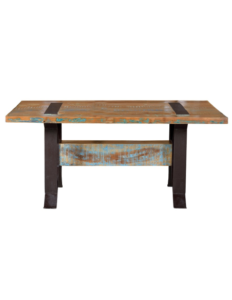 ¿Quieres saber más sobre el mobiliario fabricado en madera reciclada? Este tipo de piezas ofrece unas grandes cualidades y características, si quieres saber más sólo tiene que echar un ojo a esta increíble colección. Uno de los productos que tiene es esta mesa de comedor vintage fabricada en madera reciclada. Tiene espacio para seis personas. Su diseño cuenta con un listón que le da peso y estilo a esta pieza, cubierto por dos piezas de hierro a cada lado que son las patas y sujección del tablero de la propia mesa. Puedes acompañarla de sillas de piel del mismo estilo, vintage, o con sillas más contemporáneas lisas de diferentes colores y conseguirás un comedor de revista; estos colores los puedes elegir en función de las tonalidades de la mesa de comedor: marrones, azules, verdes, rojos... Podrás colocarla para lucirla tanto en el salón, en el comedor o incluso en la cocina si es grande. Acompáñala de muebles del mismo estilo o lisos con colores neutros y seguro que crear espacios asombrosos y espectaculares. Así que no tienes excusa, ¡atrévete y cómpralo ya!