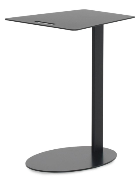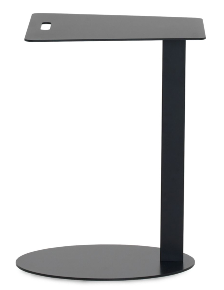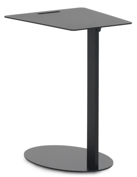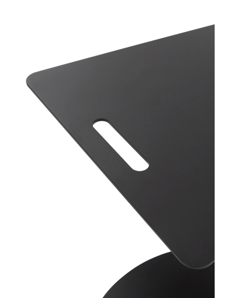 Mesa auxiliar metálica negra cuadrada, su diseño se caracteriza por una base ovalada estable y un tablero superior cuadrado con las esquinas suavemente redondeadas, que incluye una práctica ranura a modo de asa para facilitar su transporte. Su estructura en forma de 'C' permite arrimarla cómodamente al sofá o sillón, ofreciendo una superficie de apoyo siempre accesible. Fabricada en metal resistente con un acabado negro mate, esta mesa auxiliar es un ejemplo de diseño contemporáneo y práctico. Es ideal para colocar el portátil, una taza de café, o tus lecturas favoritas. Su estética minimalista se adapta sin esfuerzo a interiores modernos e industriales. Aunque requiere un montaje sencillo, su diseño inteligente y su versatilidad la convertirán rápidamente en un imprescindible de tu salón o zona de estar. Una pieza funcional que aúna diseño moderno, practicidad y facilidad de movimiento.