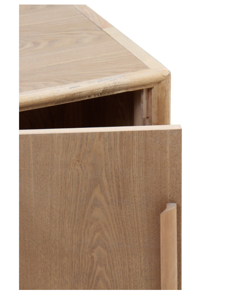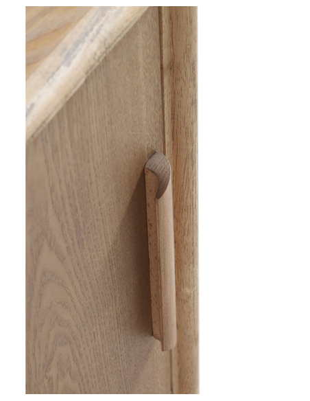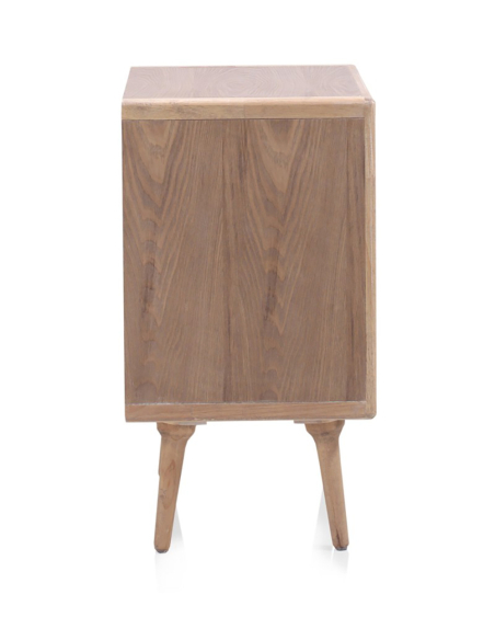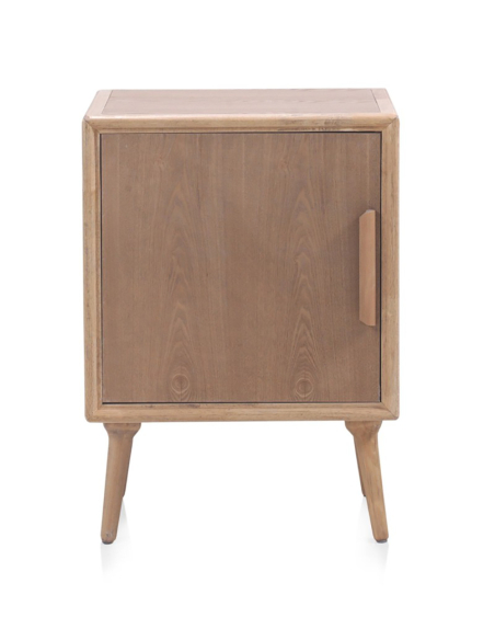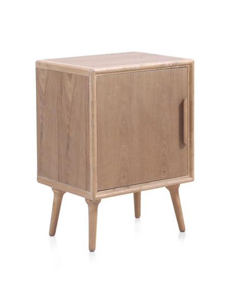 Mesita de noche Poniente 1 puerta madera fresno, fabricada en madera maciza de fresno con un acabado natural que resalta su veta, esta pieza compacta se caracteriza por sus líneas limpias, esquinas suavemente redondeadas y las típicas patas cónicas inclinadas del estilo mid-century. Su diseño funcional cuenta con una puerta que oculta un práctico espacio interior hueco, ideal para guardar libros, medicamentos o cualquier objeto personal que prefieras mantener fuera de la vista. El tirador de madera integrado en la puerta mantiene la estética minimalista y natural del conjunto. La superficie superior es perfecta para una lámpara de noche. Ideal para dormitorios de estilo escandinavo, moderno o minimalista, esta mesita de noche aporta un toque de diseño atemporal, calidez natural y funcionalidad esencial junto a tu cama.