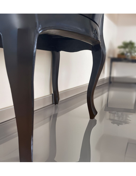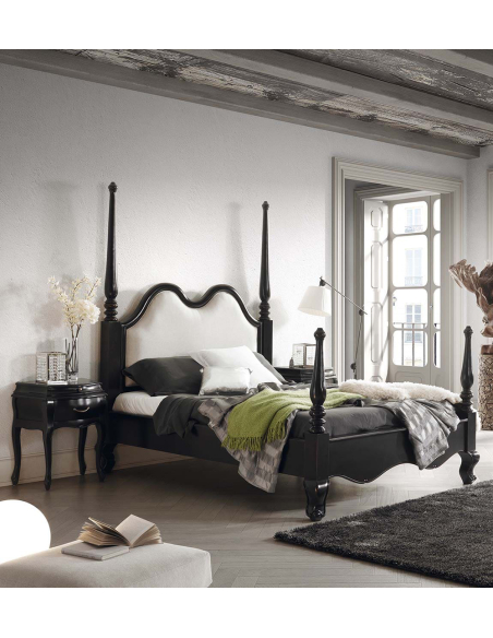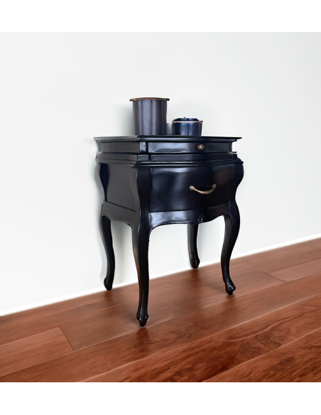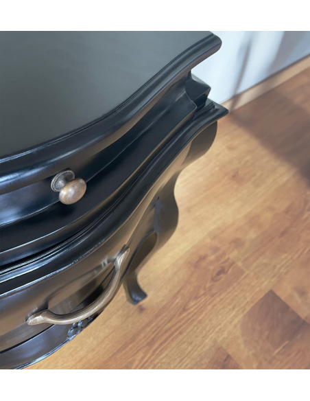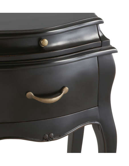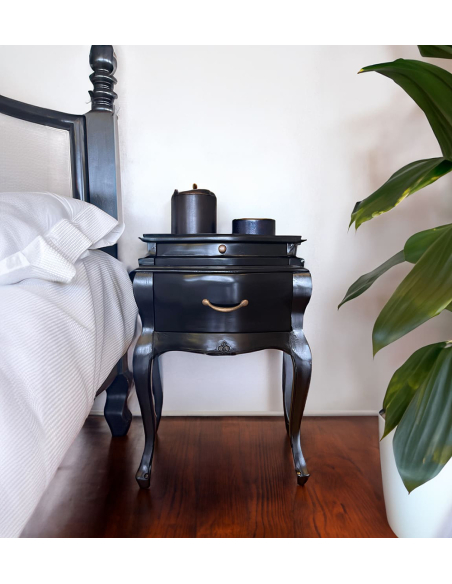 Luce un brillo especial en tu dormitorio principal con esta mesilla de noche Vintage dos cajones laca negra. Sin duda, una pieza elegante donde las haya, protagonizada por la esbeltez de sus cuatro patas torneadas de forma sinuosa, que combinan a la perfección con las ondas clásicas de los faldones. Lo barroco también se evidencia en el juego de volúmenes del doble cuerpo superior, uno con un cajón de tamaño estándar y otro con un cajón de pequeña altura. Combínala con la cama lacada en negro que te ofrece la misma colección.