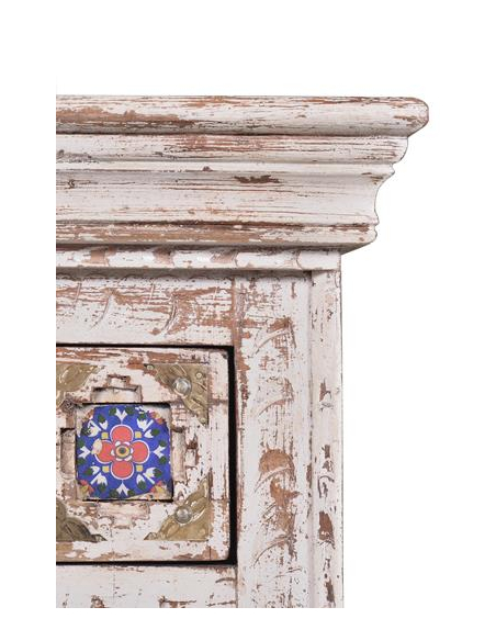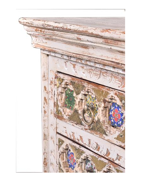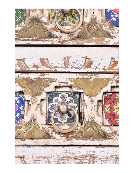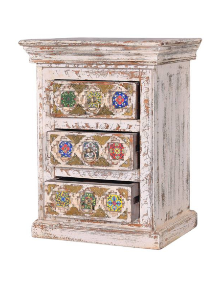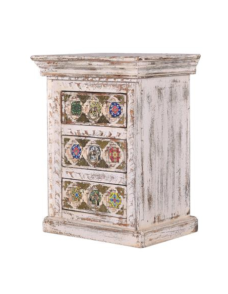 ¿Estás buscando un mueble para ordenar tus piezas del dormitorio o/y un mueble con mucho diseño con tendencias vintage?. Te presentamos la mesita de noche en madera de mango decapé, muy versátil a la hora de guardar cosas. Compuesta de tres cajones con diseños florales en apliques de cerámica, exquisita mezcla de tonos pasteles para crear un ambiente muy acogedor y de tendencias. Nuestra colección en vintage es una de las preferidas de nuestros clientes y además esta de moda.